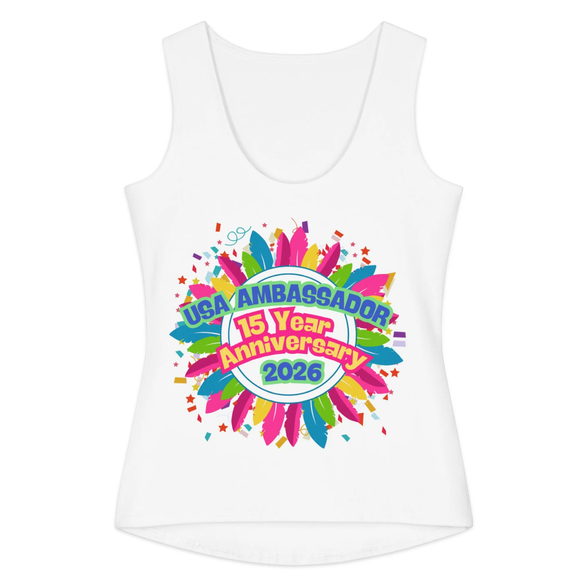 Celebrate 15 Years of USA Ambassador in our official Tank Top! Sporting fun colors and a celebratory design, you'll be feeling festive all week long!